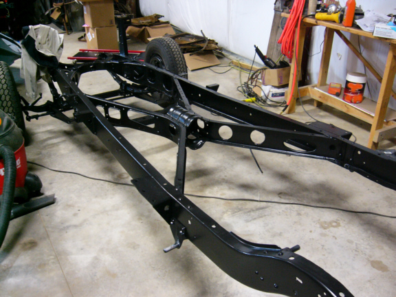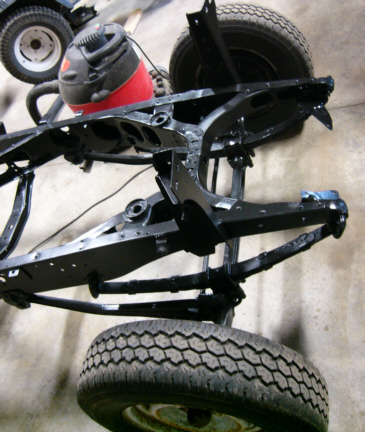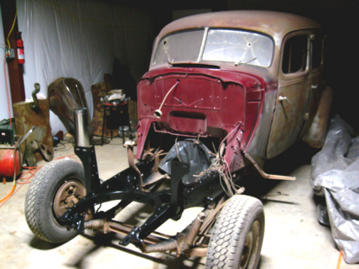 Continuing progress on removal and replacement of rusted metal. The frame is essentially completed now. All cracks repaired and the frame beefed up here and there. Brake lines replaced, shocks installed - looking pretty good. The body is now back on the frame, for good. Tim's still working replacement of rusted metal. Obtained a set of '36 correct wheels from Tom Pett in Illinois and they're at the powdercoaters now. They were baked and then blasted to clean them up. |