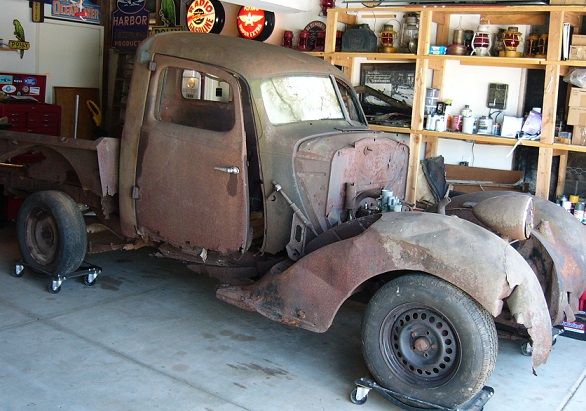 So, in April 2014, a super rare '36 pickup rustbucket finally appeared on ebay for just 1500, and I was the only one who bid on it. Once I got it delivered, a 'command decision' was made to go ahead and use the sedan as a donor car for the pickup, as the plan had been all along.