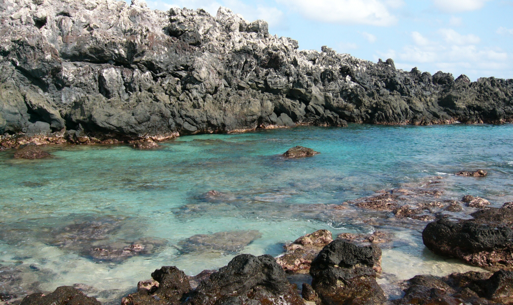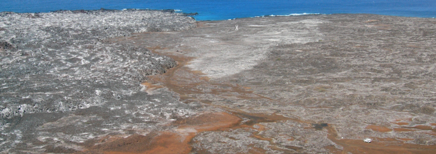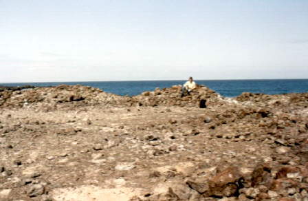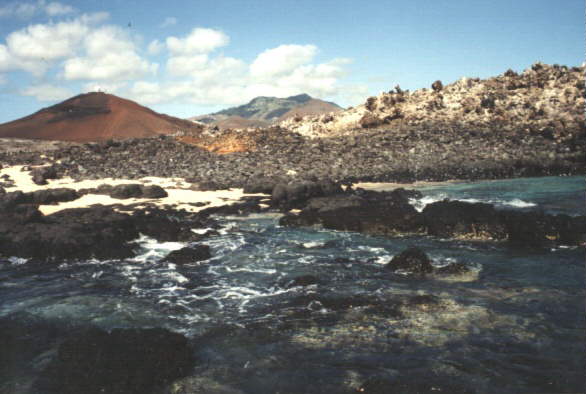 To get there, I also had to hike across the island's lava plain. It is an unforgiving landscape, consisting of hills of hard gray and brown lava formations and scattered cinders. The wind blows constantly. With nothing to serve as landmarks navigation is tricky - I am amazed that Isabel made her way through it at night! |