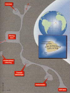 On a recent trip to Ascension, I sought out the Gill's expedition site. Isabel writes that they first observed from a naval garrison established 60 years earlier. Unfortunately, at that location clouds constantly obscured the night sky. With only a few days remaining before opposition, their measurements had to begin; the project seemed in jeopardy. One night, Isabel set out in search of clear skies, leaving her husband to fight the clouds for his measurements. Accompanied by a servant, she hiked across the lava plain. When she returned near dawn, she informed David that the skies were cloudless at a site several miles away. To salvage the trip they decided to relocate the heliometer and transit telescope. |