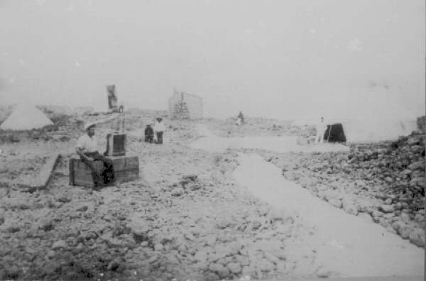 The location of the kitchen tent is still recognizable, perhaps the best preserved part of the site. The path leading off to the lower right becomes the white path entering the vintage photo from lower right. |
