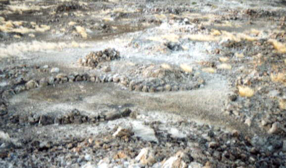 Because the nights and the dark color of the ground, the Gills had covered the paths between the tents and telescopes with white sand to make them visible by moonlight. Much sand still remains on the paths and around the clear, flat areas where the tents once stood. Isabel had lined the paths with small rocks, which remain virtually undisturbed. The telescope's brick and mortar pedestals endure also as a testament to the expedition. Now no more than weathered rubble, the piers rest upon flat rock formations slightly higher than the local terrain. The surrounding areas are cleared of debris and are also marked with sand. I was very surprised to find the site intact.
