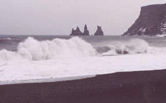 The volcanic black beach near Vik, a bizarre shoreline with unusual rock formations offshore. |