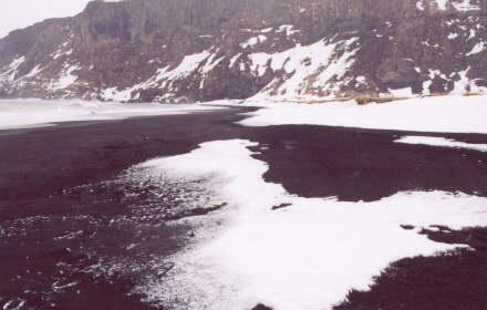 One day was spent driving to Vik, on the southern shore. The drive was interesting as it passed through numerous villages and spectacular landscape. The terrain appears to be an alluvial plain washed down from the mountains. Much snow had melted and refrozen, creating thousands of acres of land covered in few inches of frozen water. Steep cliffs dropped right down to the road in some places, and then the land dropped off to the sea. It was bright and sunny most of the way until we got close to Vik. There, at the last minute, the road ascended into high mountain country, and we found ourselves in clouds and snow.