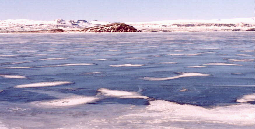 Remnants of snow drifts drying off the frozen surface of a reservoir. The ice keeps a bit of the glacier blue color. |