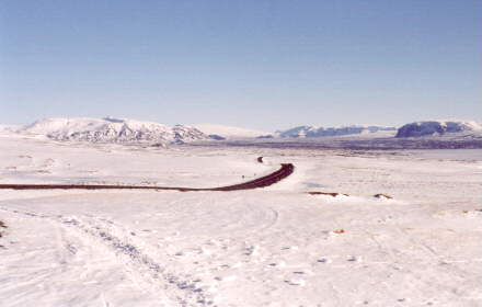 One day we drove up towards Geysir The well maintained asphalt road winds across plains of snow (and refrozen snow melt), as massive ice packs and mountains loom ahead. It's a nice drive. |